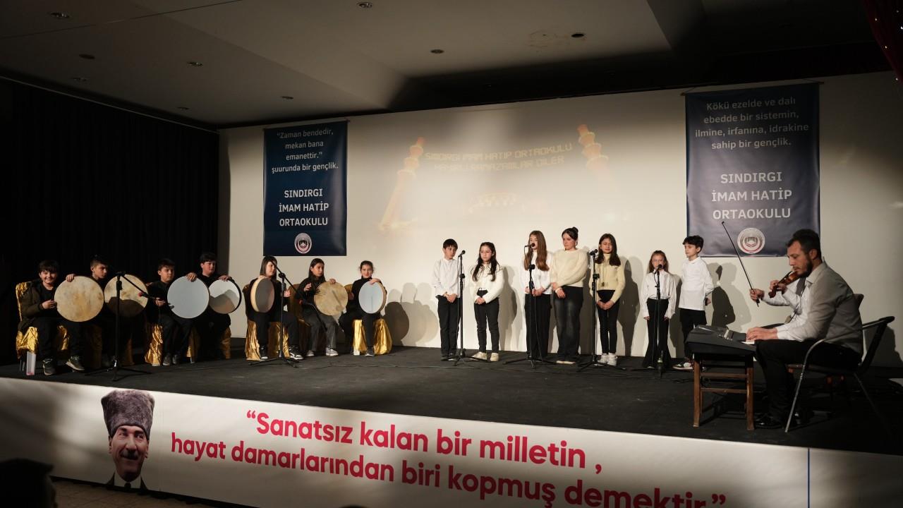 Sındırgı’da Ramazan Coşkusu: Öğrencilerden Anlamlı Program Sındırgı İmam Hatip Ortaokulu öğrenci ve öğretmenleri, 11 ayın sultanı Ramazan ayının gelişini coşkuyla karşılamak amacıyla “Hayırlı Ramazanlar” adlı program düzenledi. Akpınar Yaşam Merkezi’nde gerçekleştirilen etkinlikte, Ramazan ayının maneviyatı sahneye taşındı. Saygı duruşu ve İstiklal Marşı ile başlayan programda, Kur’an-ı Kerim tilaveti, şiir dinletileri, “Ramazan Neşesi” skeci, tiyatro gösterileri ve Ramazan davulu geleneğinin yaşatılması gibi birçok etkinlik yer aldı. Öğrenciler ve öğretmenler tarafından ilçenin çeşitli noktalarında çekilen “Ramazan Geldi” klibi izleyicilerle buluştu. Program, koro ekibinin seslendirdiği ilahilerle taçlandı. Ramazan davulu geleneğini yaşatan ve mani okuyan öğrencilere, Sındırgı Belediye Başkanı Serkan Sak tarafından bahşiş verildi. Başkan Sak, “Mübarek Ramazan-ı Şerif ayının bereketinin hepimize huzur getirmesini temenni ediyorum. Emeği geçen tüm öğrencilerimize ve öğretmenlerimize teşekkür ediyorum.” dedi. Programın hazırlanışındaki emeğe dikkat çeken İlçe Kaymakamı Didem Dinç Özay ise, “Kamera arkası görüntüleriyle bu çalışmanın ne kadar büyük bir emekle hazırlandığını gördük. Canıgönülden hazırlanmış bu program için başta öğretmenlerimiz ve öğrencilerimiz olmak üzere herkese teşekkür ediyorum. Şükürler olsun ki bir Ramazan ayına daha ulaştık. Rabbim, başta ülkemiz olmak üzere tüm İslam âleminin hayırlı ve bereketli bir Ramazan geçirmesini nasip etsin.” ifadelerini kullandı. Programa, İlçe Kaymakamı Didem Dinç Özay, Sındırgı Belediye Başkanı Serkan Sak ve eşi Gonca Sak, Belediye Başkan Yardımcısı İsmail Sönmez, Meclis Üyesi Ali Yiğit, İlçe Milli Eğitim Müdürü Muzaffer Çakır, İlçe Gençlik ve Spor Müdürü Rahmi Yörük ve daire amirleri, öğrenciler, öğretmenler, veliler ve birçok vatandaş katıldı.Sındırgı İmam Hatip Ortaokulu Öğrencilerinden “Hayırlı Ramazanlar” Programı